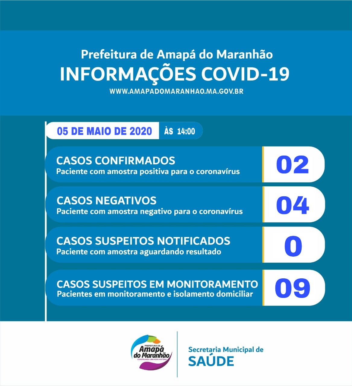Amapá do Maranhão | Prefeitura confirma os dois primeiros casos de Covid-19 na cidade Publicado em 05/05/2020 por Celso AlmeidaPor meio do boletim informativo diário, a Prefeitura de Amapá do Maranhão confirmou, os dois primeiros casos de coronavírus (Covid-19) no município. Além das confirmações, a cidade ainda possuía outros 9 casos em monitoramento.About Author Celso Almeida See author's posts