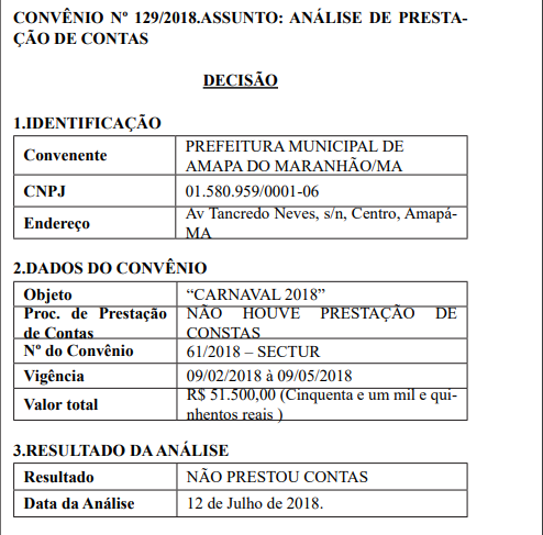 A Prefeitura de Amapá do Maranhão recebeu cerca de R$ 51 mil da Sectur, e não foi prestado contas do valor , de acordo com a publicação.