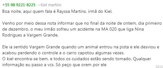 Segundo a irmã do blogueiro, Rayssa Martins, o acidente ocorreu no fim da noite de sábado (1º), quando ele seguia no sentido Vargem Grande.