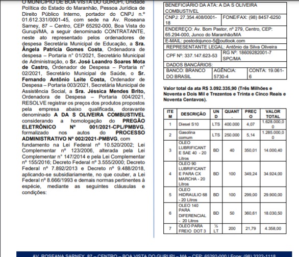 O contrato foi firmado por meio de diversas Secretarias, com a empresa A DA S OLIVEIRA COMBUSTIVEL, localizado no município de Junco do Maranhão.