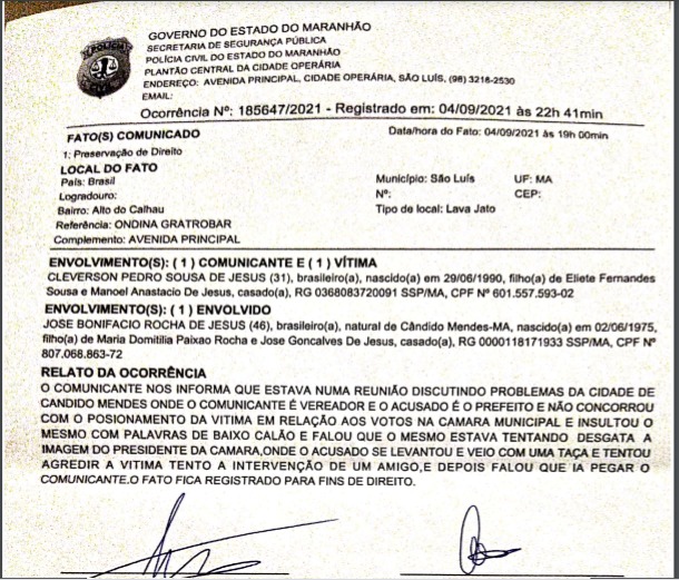 O vereador de Cândido Mendes, (distante 344 km de São Luis) Cleverson Pedro Sousa de Jesus, mais conhecido como Sababinha, registrou na noite de ontem um boletim de ocorrência contra o atual prefeito da cidade, José Bonifácio Rocha, o Facinho na capital São Luis.