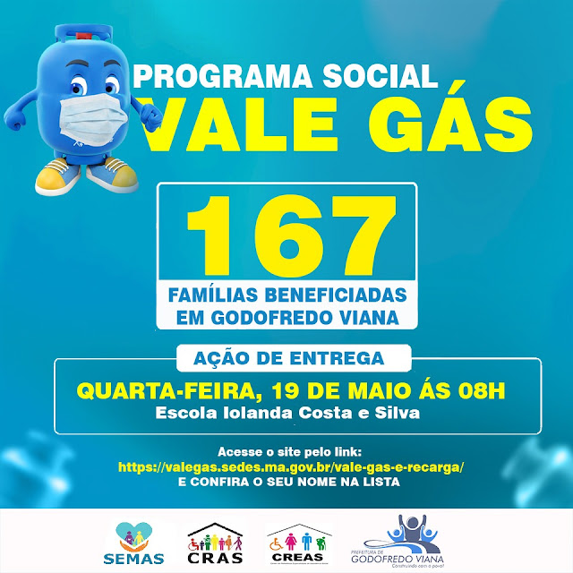 A Prefeitura de Godofredo Viana através Secretaria Municipal de Assistência e Desenvolvimento Social em parceria com o Governo do Maranhão, publicou informativo sobre os beneficiários do programa Vale Gás. Godofredo Viana teve o total de 167 famílias incluídas no programa que passarão a receber, por 3 meses, a bolsa equivalente a recarga de um botijão de gás por mês.