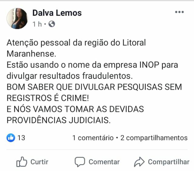 O Blog entrou em contato com a empresa INOP, apontada como sendo a executora da pesquisa DIVULGADA na última terça feira e aguarda respostas.