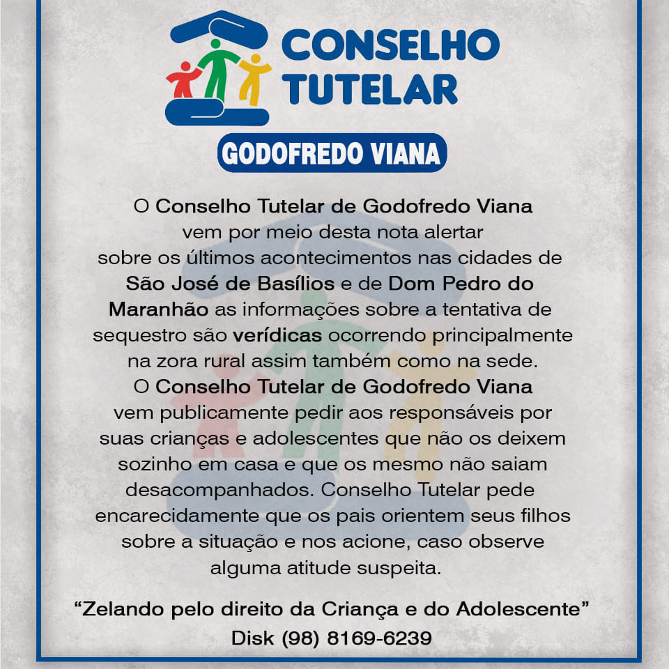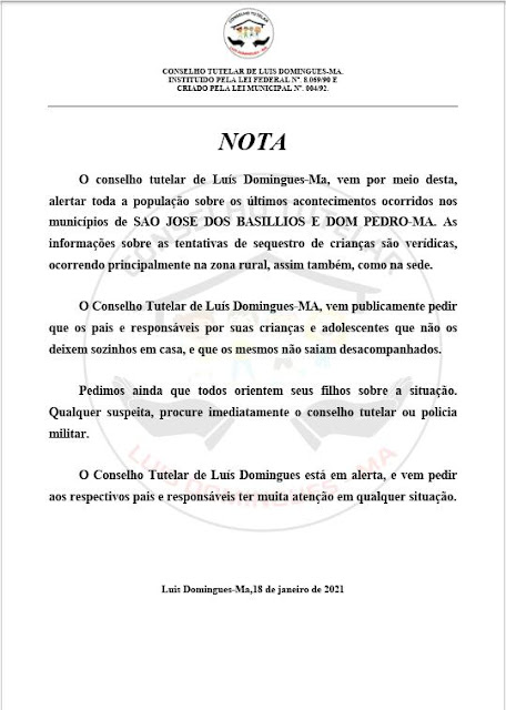 Durante a semana algumas prefeituras da região estão emitindo comunicados nas redes sociais alertando a população local sobre sequestros de crianças e adolescentes que vem acontecendo no Maranhão. A prefeitura de Godofredo Viana emitiu nesta quinta-feira (21) comunicado por meio de contas oficiais da instituição em rede sociais, no inicio da semana foram as prefeituras de Luis Domingues, Carutapera e Cândido Mendes emitirem o mesmo comunicado.