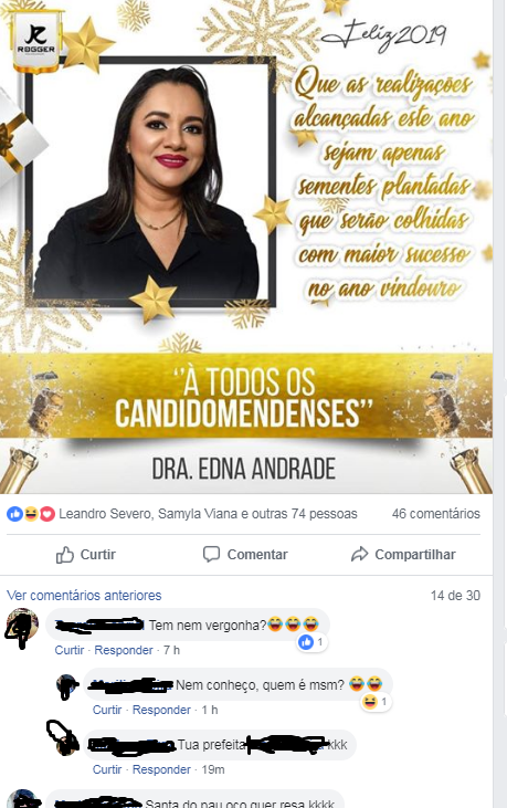 O clima era para ser de harmonia nos lares,nas redes sociais e de muitas mensagens de Feliz Natal,mais não foi este o resultado após uma Mensagem de Natal da Pré candidata a Prefeita da cidade de Cândido Mendes divulgado nas redes sociais pela equipe da prefeitura municipal na ultima segunda feira (24).Vários internautas e moradores da cidade repudiaram a mensagem da Advogada e pré candidata a prefeita do município o que mostra o tamanho de sua rejeição. A advogada será apoiada pela equipe do atual prefeito Mazinho Leite nas eleições municipais de 2020.