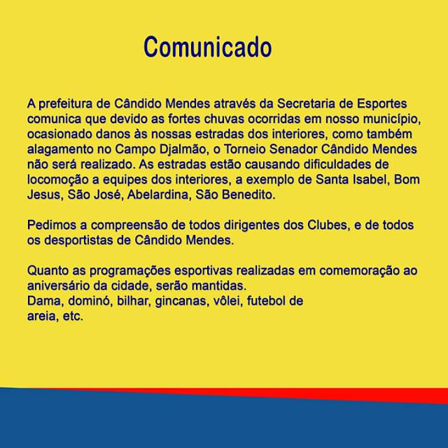 O cancelamento do Tradicional torneio Senador Cândido Mendes foi anunciado hoje via rede social pela secretaria municipal de esportes da cidade.