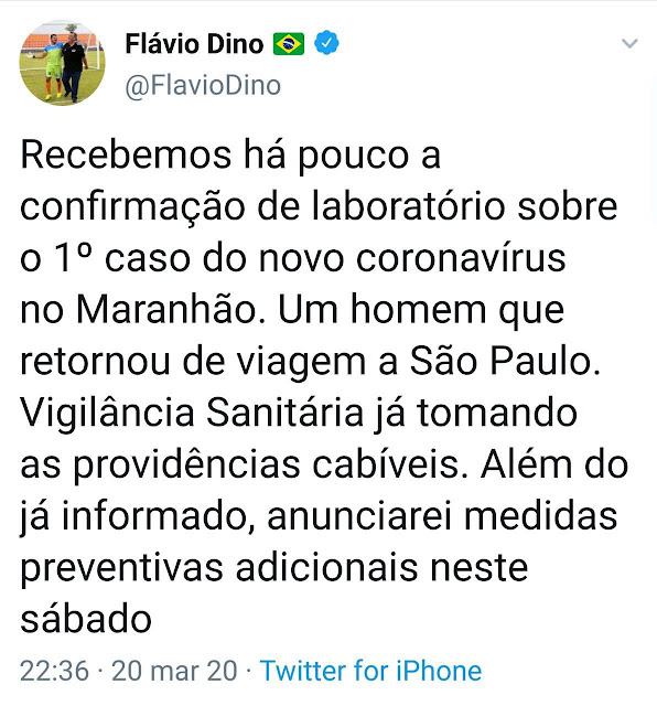 Está confirmado o primeiro caso de infecção por novo coronavírus (Covid-19) no Maranhão.